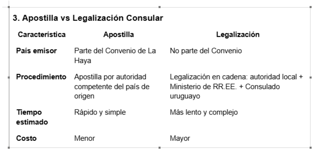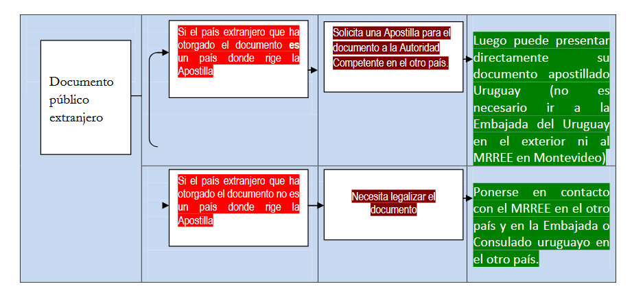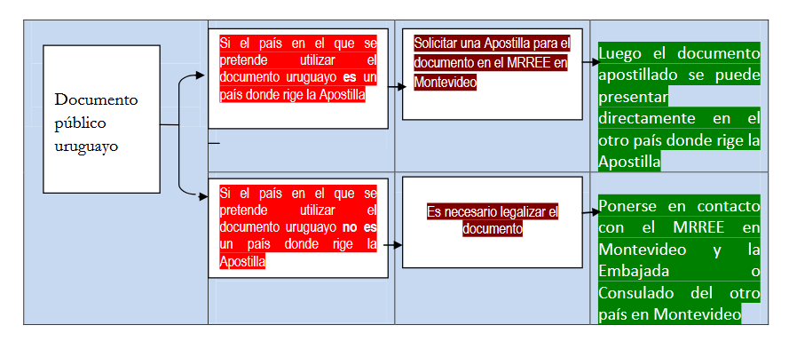 Llevar su documento público uruguayo al Ministerio de Relaciones Exteriores (MRREE) en Montevideo; allí verificarán el origen de su documento, y si corresponde, expedirán una “Apostilla” certificando su origen. Este certificado es reconocido automáticamente en todos los demás países donde rige la Apostilla. En los países donde no rige la Apostilla, se seguirán aplicando los procedimientos de legalización actuales.